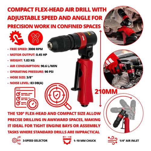 The Flex-Head 3/8” Drill is designed to excel in tight and awkward working environments where traditional drills fall short. Its unique 120° adjustable-angle handle ensures exceptional manoeuvrability, providing ideal access for drilling out broken bolts and other tasks that require high precision. This compact solution eliminates the bulk and limitations of cordless drills with large battery packs.