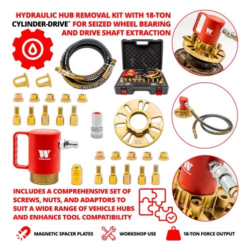 Specially designed by Welzh for removing stubborn wheel bearings/Hubs. Its powerful Built-In 18-ton hydraulic Cylinder-Drive™ allows the most effective removal of severely seized and rusty drive shafts where conventional pullers will fail.